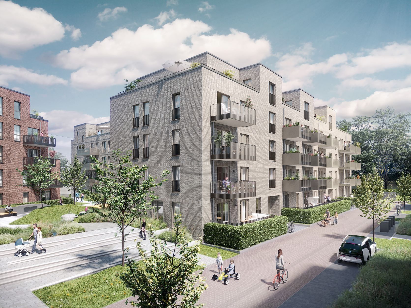 Auf einem ehemaligen Autohausgelände entstehen 232 moderne und praktisch ausgestattete Wohneinheiten, die sich auf 15 Wohngebäuden mit Tiefgarage und einer Kita verteilen.